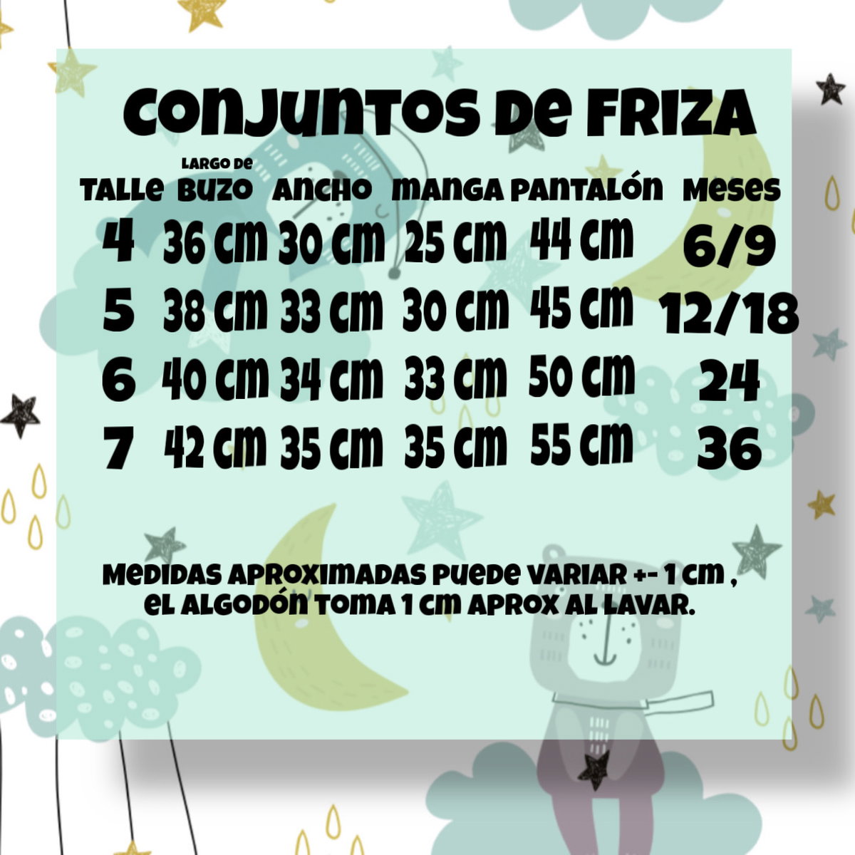 MedĂ el largo de un bucito de Friza que ya tengas o guĂate con la tabla de medidas.