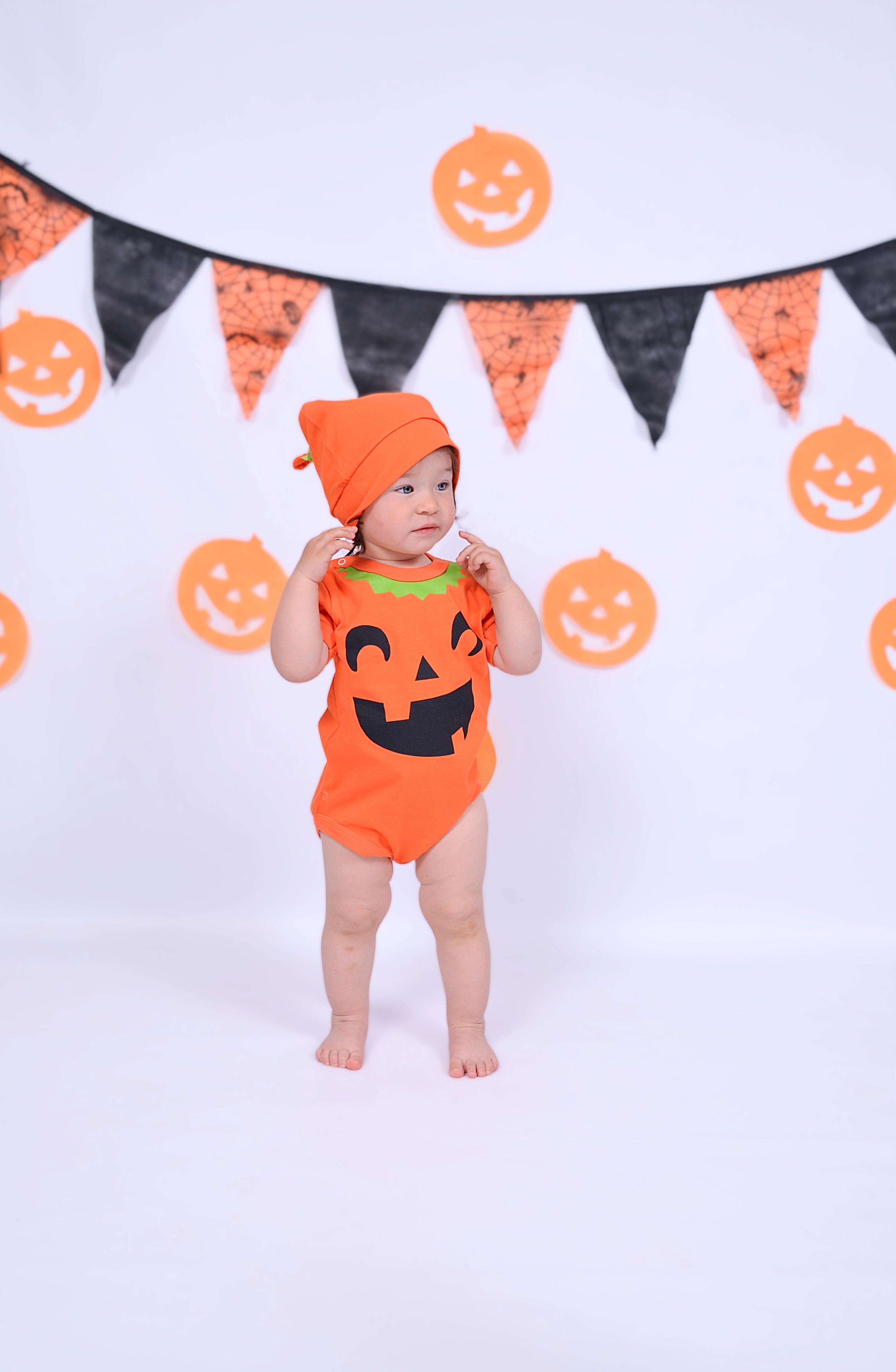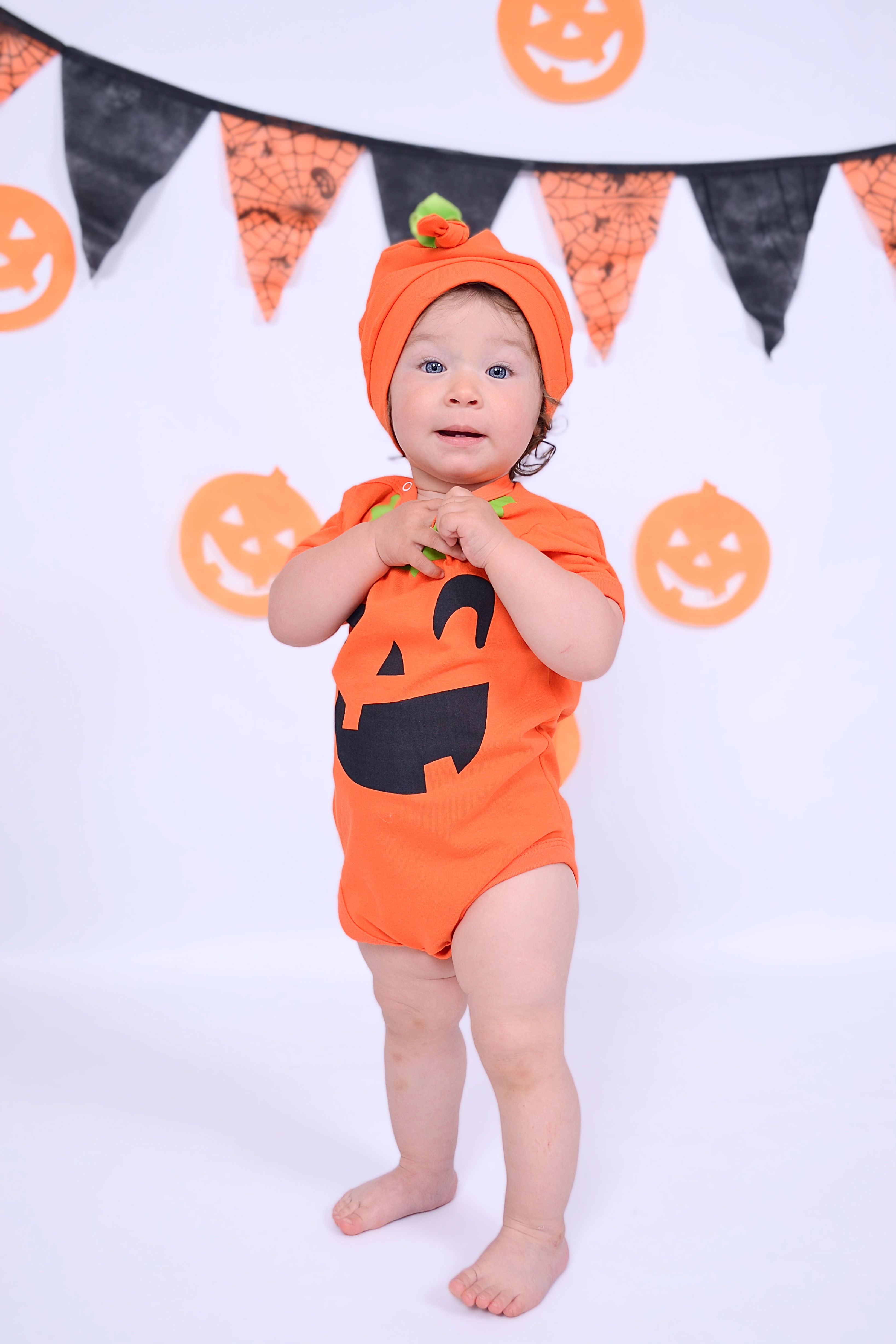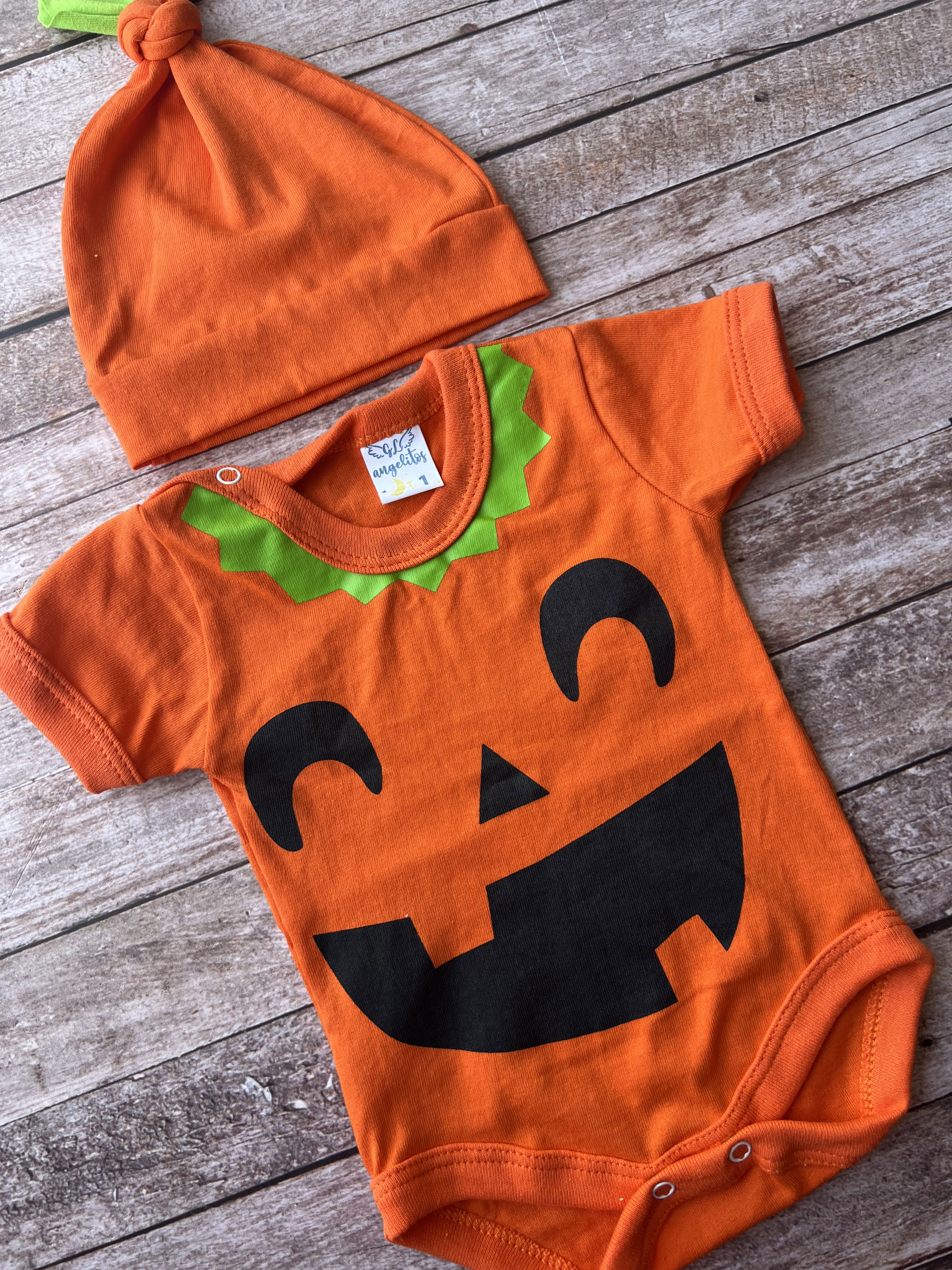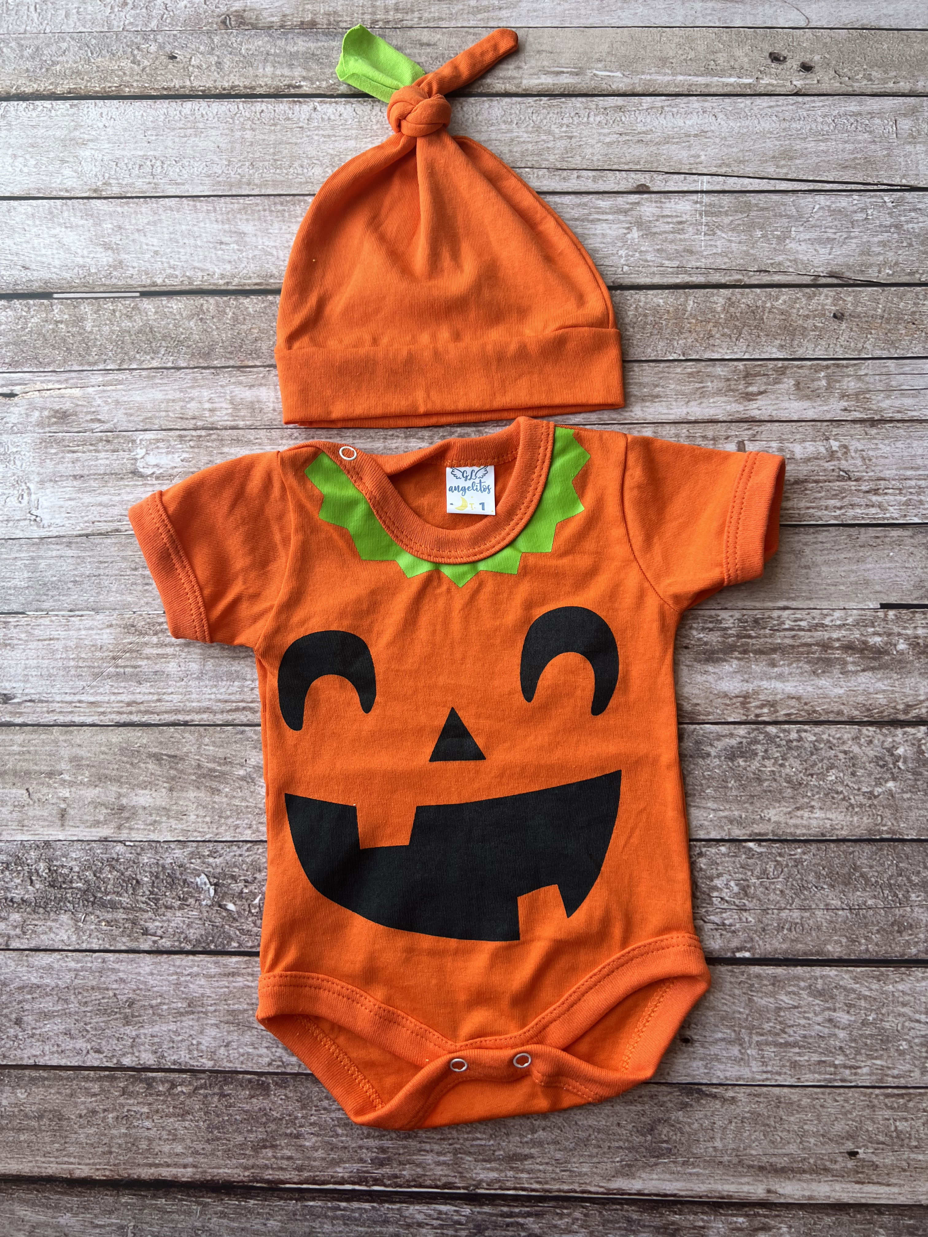 Este hermoso dúo de calabaza incluye un body y un gorrito combinado, ideal para que tu bebé viva su primer Halloween con dulzura y comodidad.