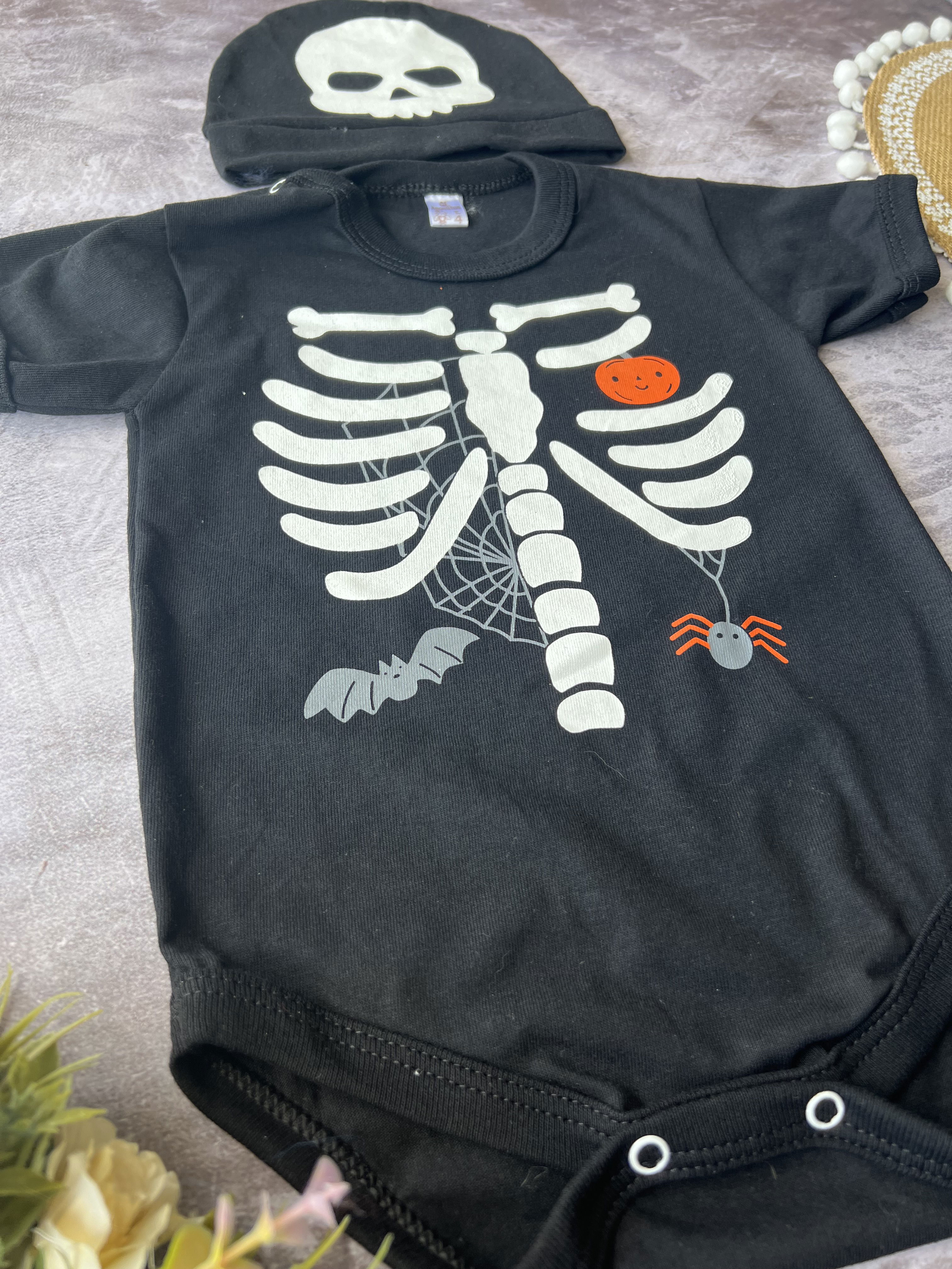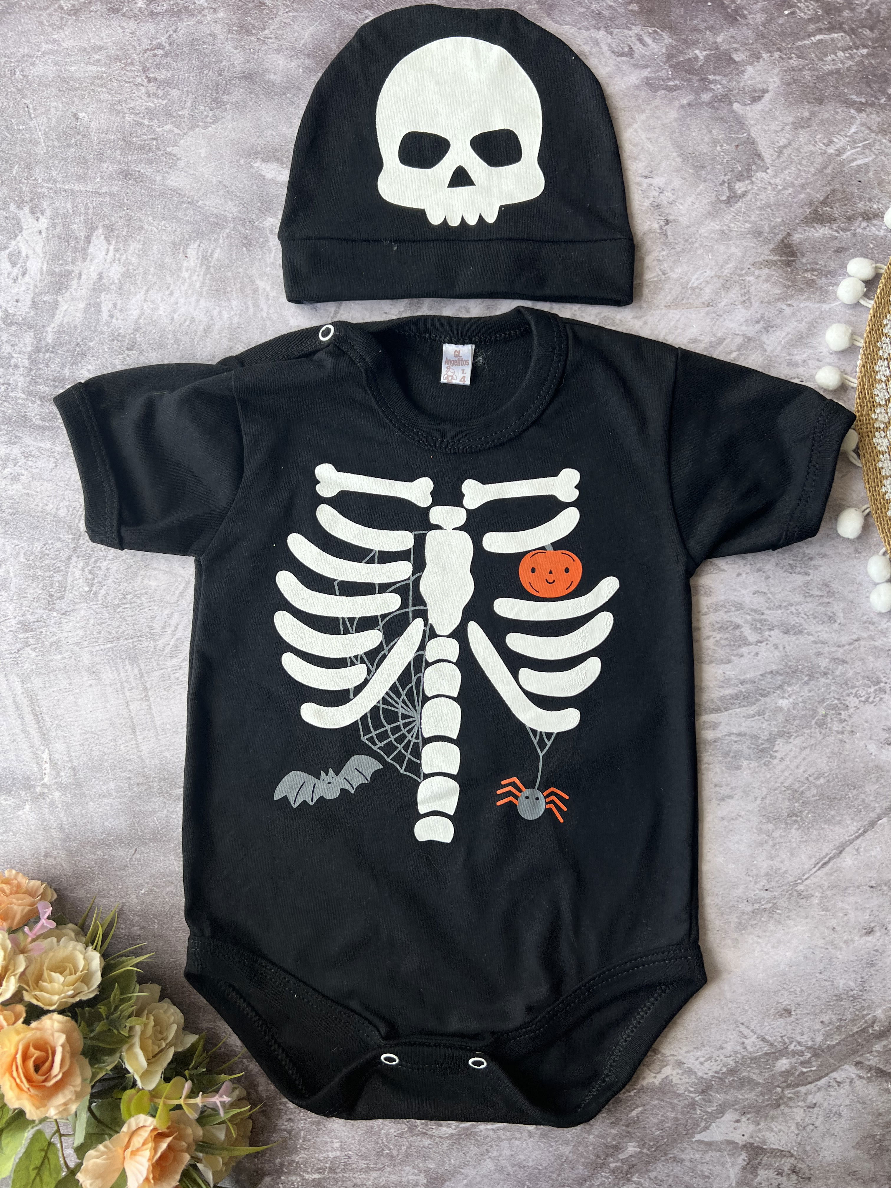 Nuestro dúo esqueleto combina un body y gorrito temático, perfectos para celebrar Halloween con un toque divertido y lleno de ternura. 👶🎃