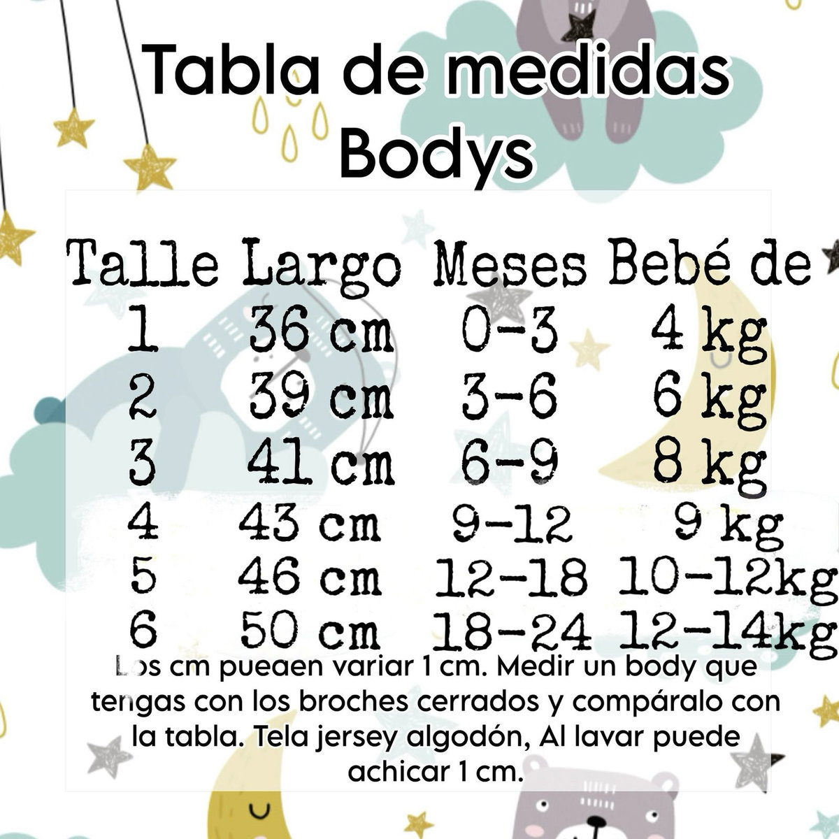 Medidas de los bodys en fotos